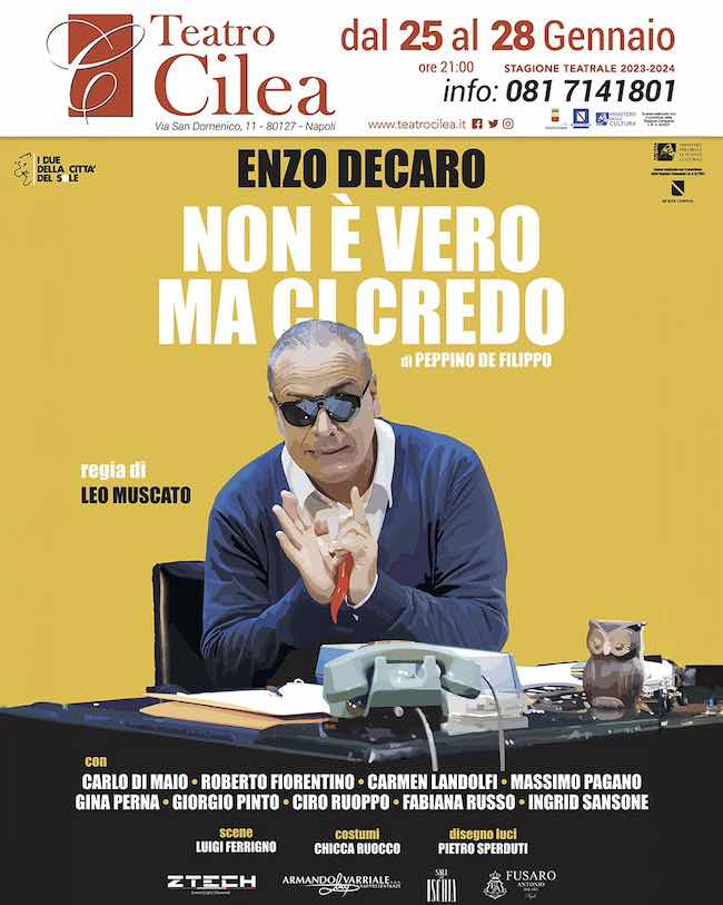 Quattro appuntamenti per il ritorno teatrale di Enzo Decaro che con Massimo Troisi e Lello Arena è stato tra i protagonisti della nuova scuola napoletana della comicità moderna. Fino a La Smorfia la comicità di Napoli era ad appannaggio di artisti del calibro di Totò, Nino Taranto e Peppino De Filippo autore, appunto, di questa commedia che Decaro porterà per la prima volta in scena sul palco del rinomato teatro vomerese. Lo spettacolo dal titolo “Non è vero ma ci credo” ha la regia di Leo Muscato il quale ha iniziato la sua carriera nella compagnia di Luigi De Filippo.