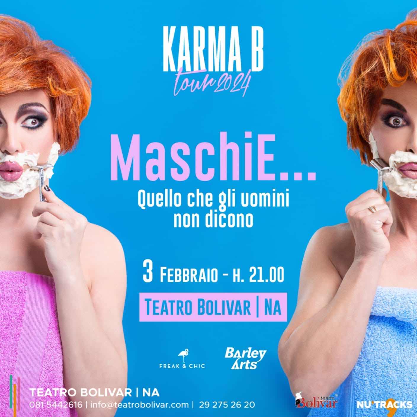 Sabato 3 febbraio, alle ore 21.00, torna sul palco del Teatro Bolivar (Via Bartolomeo Caracciolo, 30), diretto da Nu’Tracks, l’esuberante duo di drag queen “Karma B” con il novo spettacolo “MaschiE… Quello che gli uomini non dicono”, uno show dal vivo unico e frizzante sul tema della maschiologia tra musica, stand up comedy e look da capogiro.
