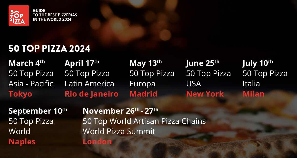 L’edizione 2024 si chiuderà il 26 e il 27 novembre a Londra, con il World Pizza Summit, all’interno dell’European Pizza & Pasta Show, e la premiazione delle migliori catene artigianali di pizzerie al mondo, 50 Top World Artisan Pizza Chains.