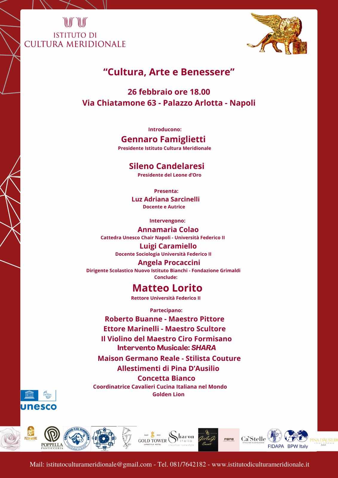 Si terrà a Napoli la prima edizione della rassegna “CULTURA, ARTE e BENESSERE” il giorno Lunedì 26 febbraio alle ore 18:00 presso la sede delI’istituto di Cultura Meridionale, Via Chiatamone 63,