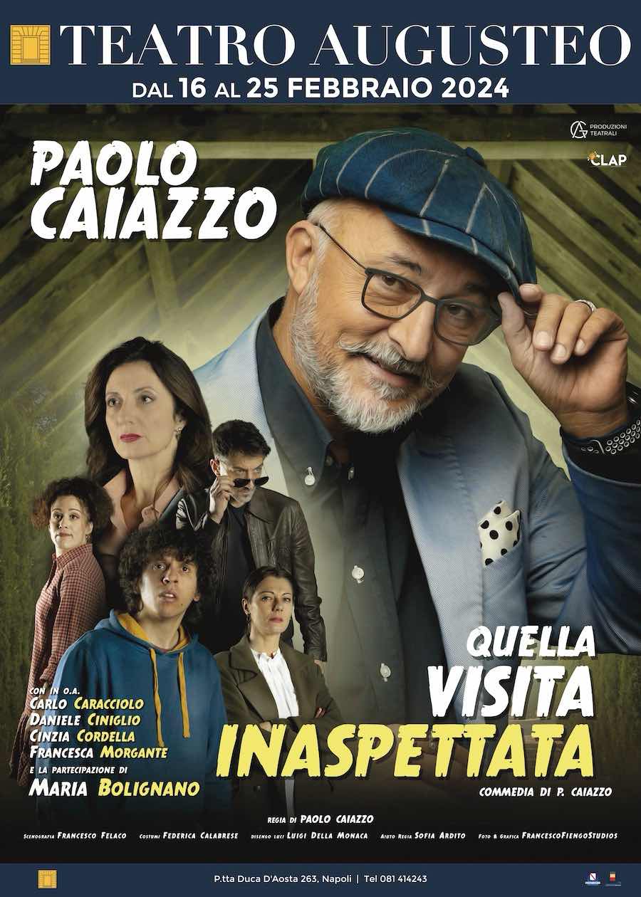 Venerdì 16 febbraio, al teatro Augusteo (Napoli, Piazzetta duca d’Aosta 263), il debutto nazionale di “Quella visita inaspettata”, commedia in due atti scritta e diretta da Paolo Caiazzo, protagonista in scena fino a domenica 25 febbraio. Con lui sul palco, in ordine di apparizione, anche Carlo Caracciolo, Daniele Ciniglio, Cinzia Cordella, Francesca Morgante e la partecipazione di Maria Bolignano.