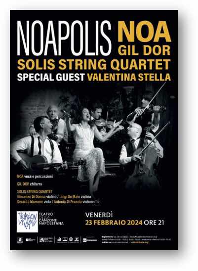 Venerdì 23 febbraio, alle 21, l’artista internazionale Noa torna nel teatro di Forcella con Gil Dor e il Solis string quartet in “NOApolis”. Il concerto inaugura “Il mondo fa tappa a Napoli”, la rassegna di sette appuntamenti con artisti internazionali che interpretano e si confrontano con il repertorio partenopeo. Ospite speciale della serata Valentina Stella.