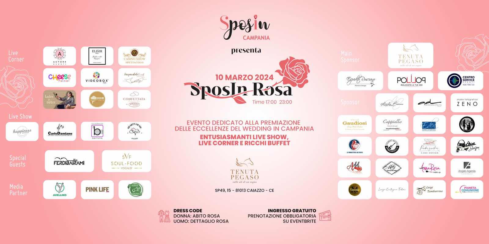 Domenica 10 marzo 2024 si terrà “SposIn Rosa”, l'evento dedicato alle eccellenze del wedding regionale, organizzato da SposIn Campania: l'unica rivista del Wedding ed Eventi, fondata dai fratelli Zappella. Nella splendida location di Tenuta Pegaso a Caiazzo, in provincia di Caserta, si ritroveranno le migliori aziende e professionisti del settore, per un party celebrativo in occasione della quinta edizione del “The Best of Sposincampania”: la competizione social che ogni anno mette in gara tra loro i fornitori di ogni categoria del comparto wedding. Oltre 50 premi che saranno consegnati alle aziende e professionisti che si sono aggiudicati, a suon di click e preferenze della community, l’ambito riconoscimento. Ci saranno anche i premi redazionali, assegnati ai partner maggiormente fedeli al progetto SposIn Campania, ma anche a chi si è distinto nell'e che evidenzia tutte le innovativo ed esclusivo servizio del Matrimonio Live Social, l'unico mezzo in real time che celebra l'unione degli sposi peculiarità di ogni singola azienda impegnata nell'organizzazione dell'evento. SposIn Rosa è l'occasione giusta per le future coppie di sposi, ma non solo, per conoscere i tanti professionisti del settore e per trascorrere una giornata all'insegna del divertimento e della spensieratezza. Infatti, a Tenuta Pegaso, a partire dalle ore 17 e fino alle 23, si susseguiranno entusiasmanti live show, live corner e ricchi buffet con INGRESSO GRATUITO.
