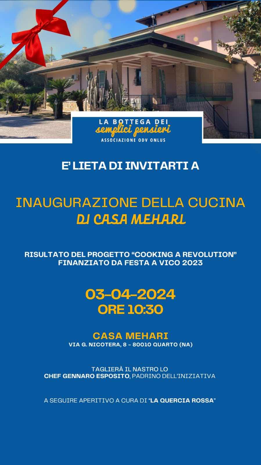 La realizzazione della cucina è stata possibile grazie al progetto “Cooking a Revolution” finanziato con "Festa a Vico”, la tre giorni dedicata alla grande cucina con chef affermati e giovani promesse con l’obiettivo di raccogliere fondi per progetti solidali. La tradizionale kermesse enogastronomica si svolge a Vico Equense e nel 2023 ha finanziato sei progetti tra cui quello dell'associazione “La Bottega dei Semplici Pensieri”. Patron della manifestazione è lo chef Gennaro Esposito che martedì taglierà il nastro all’inaugurazione della cucina. Insieme allo chef due stelle Michelin parteciperanno: il sindaco di Quarto Antonio Sabino, la psicologa Vittoria Vigo, ed Elvira Carrabba, presidente della Cooperativa “La Quercia Rossa”.