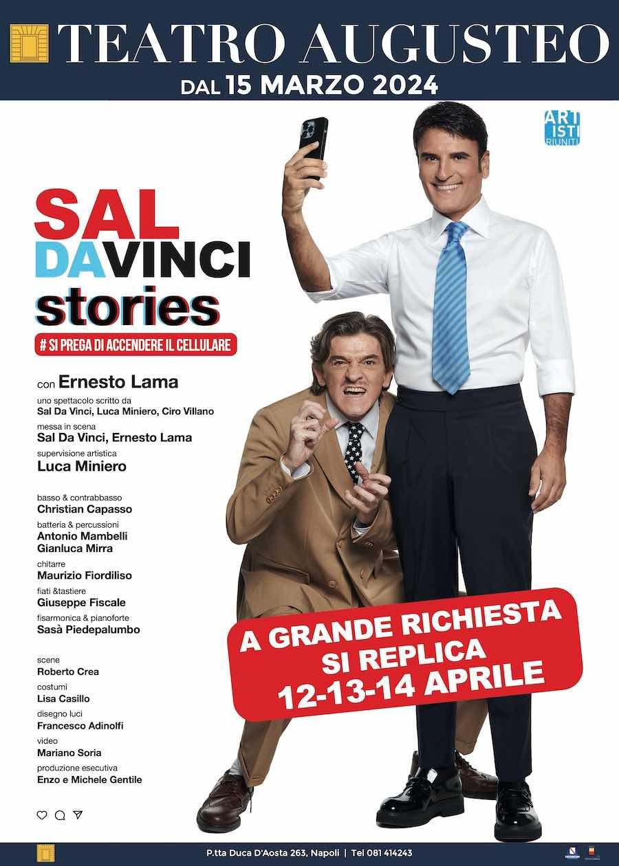 Da Vinci sarà in scena da venerdì 15 a domenica 24 marzo, e da venerdì 12 a domenica 14 aprile al teatro Augusteo (Napoli - Piazzetta duca D’Aosta 263), in “Sal Da Vinci Stories” di Luca Miniero, Ciro Villano e Sal Da Vinci, con la regia di Luca Miniero. Con lui sul palco anche Ernesto Lama e musica dal vivo.
