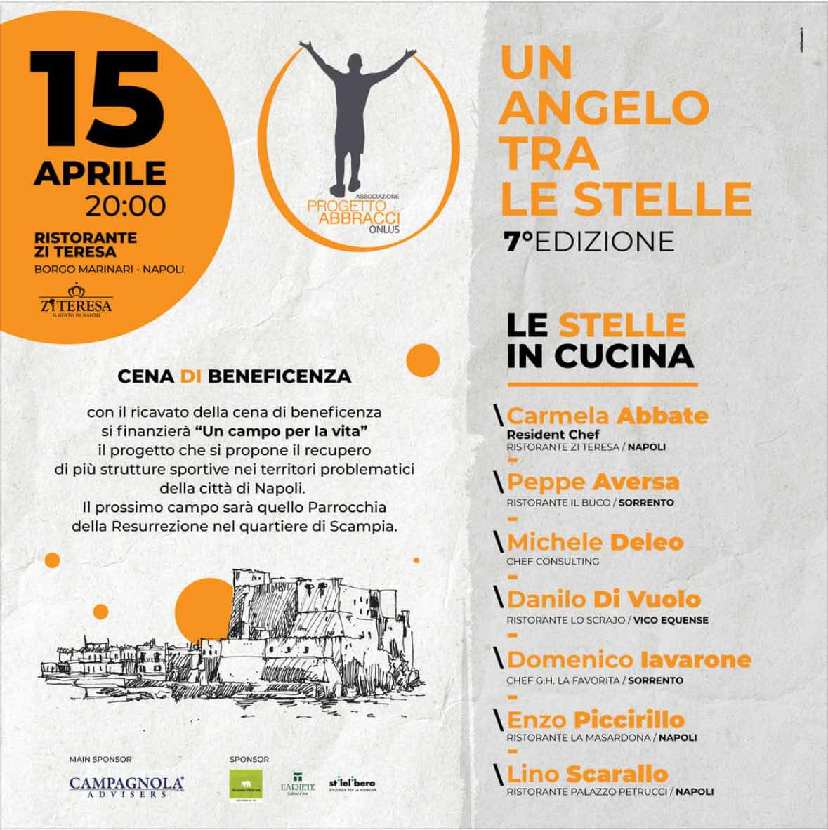 Lunedì 15 Aprile, alle ore 20, lo storico ristorante Zi Teresa ospita la Settima Edizione di “Un Angelo tra le Stelle” la cena di beneficenza organizzata da Claudio e Giovanna Zanfagna, fondatori dell’Associazione Progetto Abbracci Onlus, che vede alternarsi ai fornelli chef stellati e grandi interpreti della ristorazione campana per una raccolta fondi a favore dell’infanzia dei quartieri più disagiati del territorio napoletano. Il ricavato della cena sarà infatti interamente devoluto al progetto “Un Campo per la Vita” con il quale i coniugi Zanfagna si impegnano a recuperare e allestire il campo da gioco della Parrocchia della Resurrezione del quartiere Scampia.