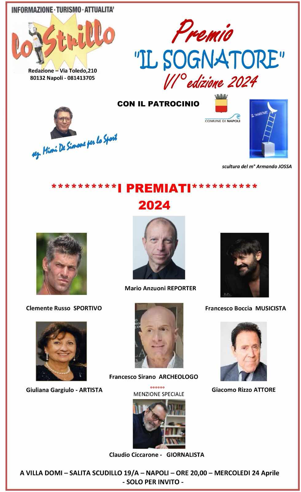 Si terrà il prossimo 24 aprile, alle ore 20,00, presso Villa Domi – Sala Bianca (via Salita Scudillo, 19/A, Napoli), in una serata-evento (ad inviti), la sesta edizione del premio "IL SOGNATORE", istituito dal giornale Lo Strillo, che gode del patrocinio morale del Comune di Napoli e che verrà consegnato a 6 personalità che, secondo il parere insindacabile dell’organizzazione, sono dei sognatori, o per il loro percorso di vita, o perché hanno fatto sognare gli altri, o perché hanno realizzato i loro sogni. Il premio consiste in un’originale e caratteristica scultura realizzata dal noto maestro Armando Jossa, i premiati di questa nuova edizione sono: Mario Anzuoni, fotoreporter internazionale, presente in tutte le manifestazioni di prestigio e punto di riferimento per numerosi divi e dive,Clemente Russo, ex pugile, campione del mondo dei dilettanti a Chicago 2007 e ad Almaty 2013, vicecampione olimpico a Pechino 2008 e a Londra 2012, personaggio televisivo e dal 2021direttore tecnico del Gruppo Sportivo Fiamme Azzurreappartenente al Corpo di polizia penitenziaria, a cui andrà il Premio Il Sognatore - Mimì De Simone, dedicato alla memoria del nostro mitico direttore e fondatore de Lo Strillo, Giuliana Gargiulo, decana delle giornaliste italiane, attrice, scrittrice, conduttrice di eventi, esponente di spicco del mondo della cultura e del teatro, Francesco Sirano, direttore del Parco Archeologico di Ercolano dal 2017, fortemente impegnato nella valorizzazione di questo importantissimo sito, il cantautore e musicista Francesco Boccia, rivelazione del Festival di Sanremo 2001 con il brano “Turuturu”, autore di “Grande Amore”, pezzo con cui Il Volo vinse il Festival del 2015 e di “Quando ti sei innamorato”, che ha segnato la rinascita di Orietta Berti a Sanremo 2021, uno dei fautori del progetto TheSuper4, e l’attore, regista e autore di testi teatrali Giacomo Rizzo, icona nazionale del mondo teatrale, cinematografico e televisivo, artista eclettico e versatile, apprezzato e stimato dal pubblico e dalla critica. Una menzionespeciale andrà a Claudio Ciccarone, giornalista, curatore della rubrica della Rai Tgr Campania, “Il Leggilibri” e di “Libriamoci”, dedicata al mondo letterario. Nel corso della serata, condotta dal direttore responsabile Anna Maria Ghedina e dal vicedirettoreAntonio D’Addio, coadiuvati dal bravo top model e promettente attore Nicola Coletta, ci saranno vari momenti di spettacolo affidati alla nota interprete e attrice Anna Calemme, ambasciatrice della canzone classica partenopea nel mondo, impegnata nella promozione del singolo “Napule nun po chiu aspettà”, distribuito dalla Mediterranea produzioni di Carmine Caiazzo, e alla brava collega giornalista Maresa Galli, apprezzatissima interprete jazz, che sarà accompagnata live dal chitarrista Enzo Amazio. Un ringraziamento va a chi ha consentito la serata ovvero Villa Domi con il suo patron Domenico Kontessa, la boutique Keave, la cooperativa dei Fiori e Mercato dei fiori di Ercolano, Glemart Grafica e Stampa e Asd Social Event e Promotion di Luana R. Cavazzuti, De Nigris Editori. Prevista la partecipazione di personalità del mondo dello spettacolo, della cultura, del giornalismo, dell’arte e dell’imprenditoria, che hanno già confermato la loro presenza, ma che manteniamo top secret per non rovinare le sorprese. Al termine un ricco buffet offerto da Villa Domi.