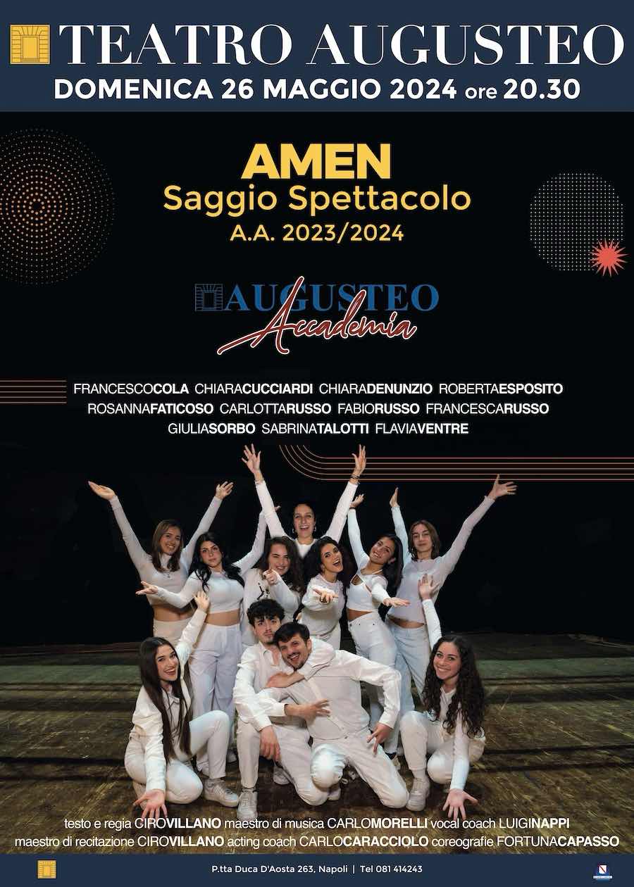 Gli allievi del primo anno dell’Accademia Augusteo, giovani talenti perfezionati attraverso corsi e workshop di recitazione, danza e canto, svolti presso il teatro Augusteo e il Politeama di Napoli, il cinema teatro Pierrot di Ponticelli, saranno in scena con tre saggi spettacolo:
