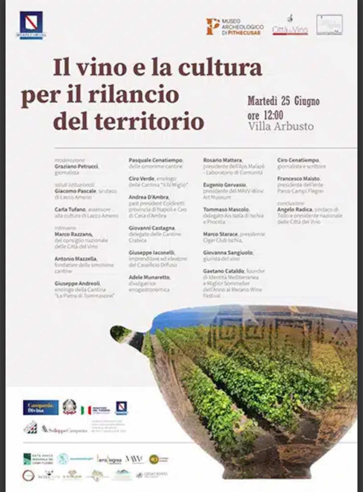 È un evento di grande rilievo per il rilancio dell’ Ischia e non solo, infatti è in programmazione alle ore 12:00 di martedì 25 giugno il convegno “Il Vino e la Cultura per il Rilancio del Territorio” presso Villa Arbusto, Lacco Ameno, grazie ad una sinergia tra l’associazione culturale Identità Mediterranea, l’Associazione nazionale delle Città del Vino, con il Comune di Lacco Ameno e, in particolar modo, con l’assessorato alla cultura della cittadina ischitana.