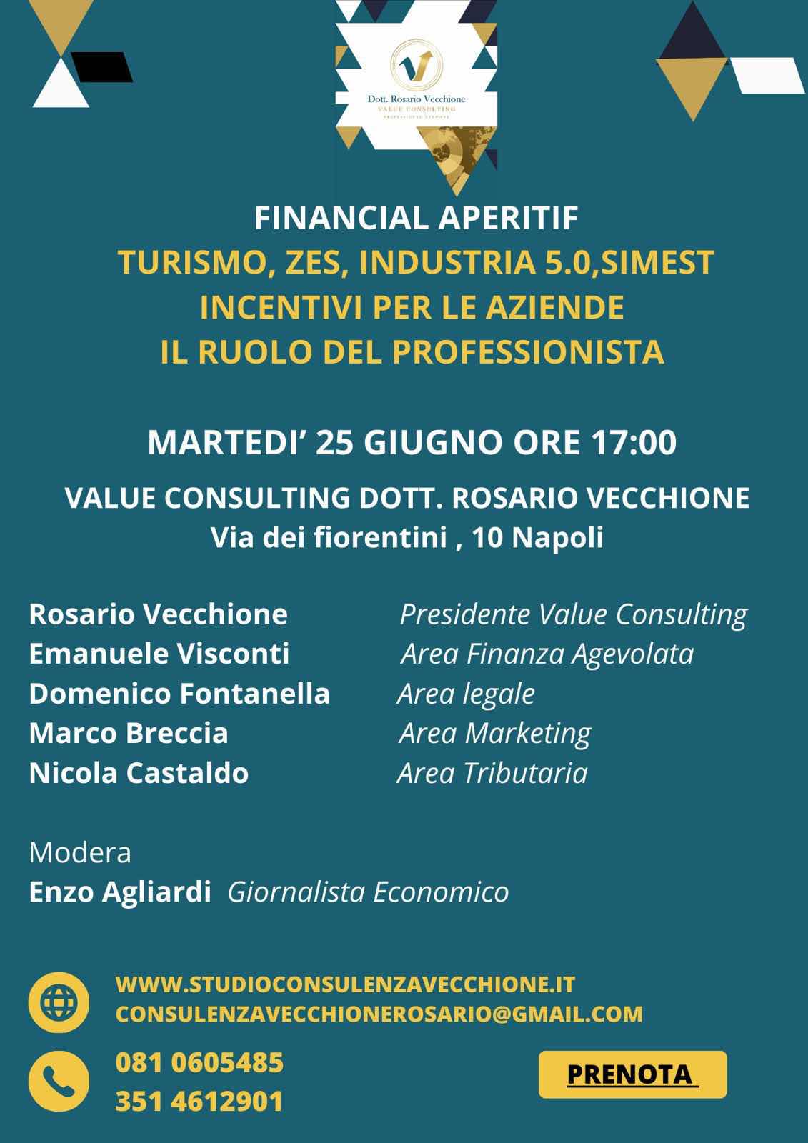Ne parleremo all'"Aperitivo finanziario" con gli autorevoli professionisti associati di Value Consulting, prestigioso business network che ho l'onore di presiedere in un nuovo "spazio conviviale" interamente dedicato agli Imprenditori e ai desideri di sviluppo delle loro Aziende.