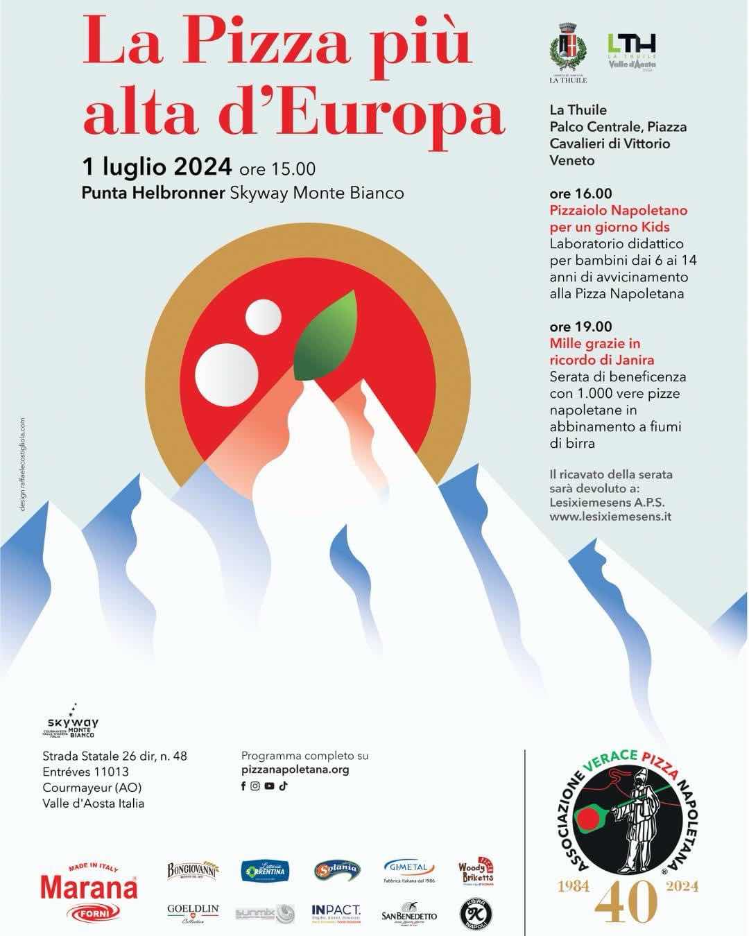 La serata proseguirà con “Mille grazie in ricordo di Janira”, l’evento di beneficenza dedicato alla nipote del maestro pizzaiolo Salvatore De Rinaldi prematuramente scomparsa, che vedrà la realizzazione di oltre 1.000 pizze nell’incredibile paesaggio della cittadina valdostana, il cui ricavato sarà devoluto all’Associazione Lesixiemesens A.P.S.
