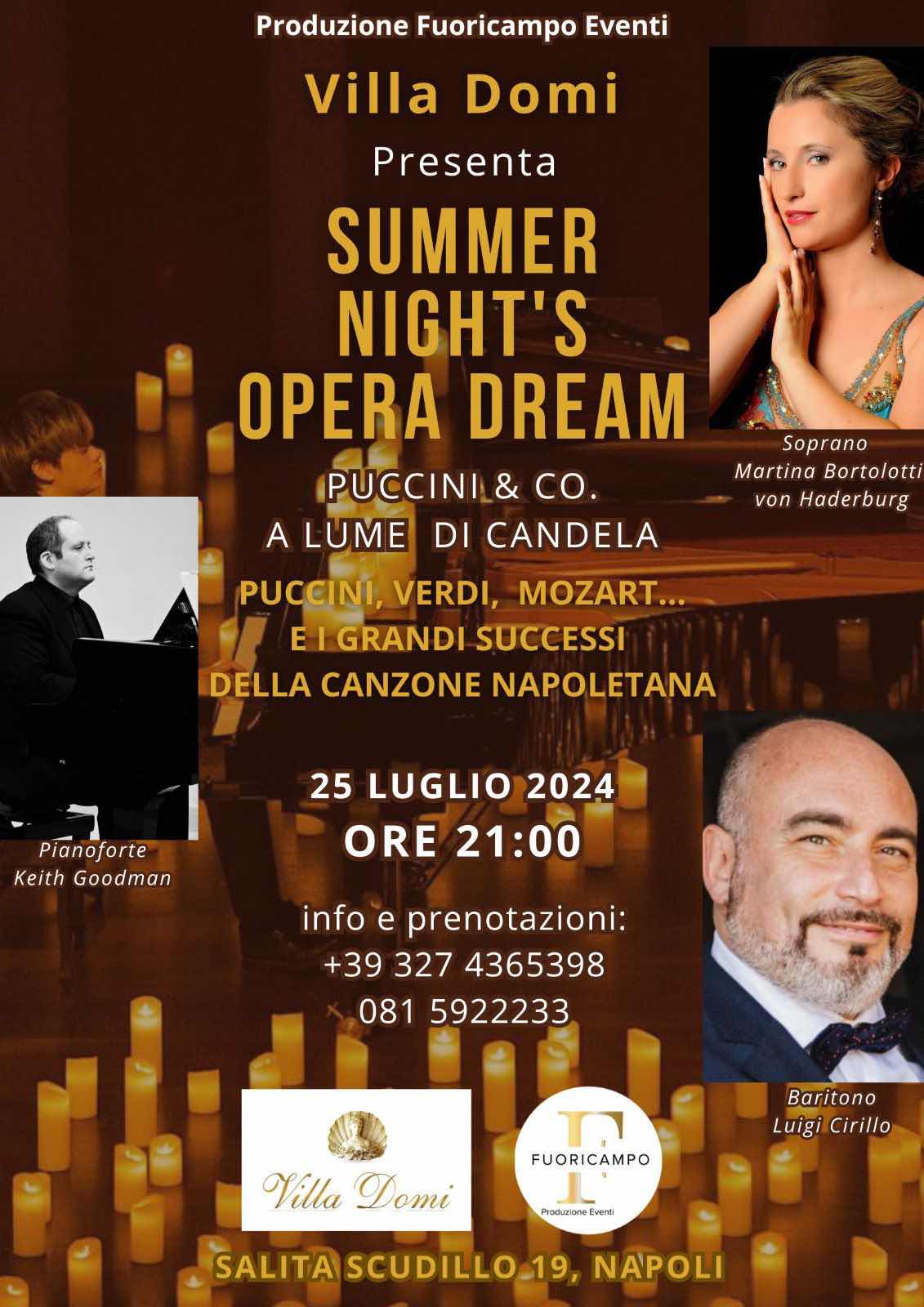 Prodotto dalla “Fuori Campo Eventi” di Mirka Contessa, la serata organizzata nella suggestiva cornice di Villa Domi, sarà un viaggio musicale a lume di candela che spazia da Puccini a Verdi da Di Capua a Mozart.
