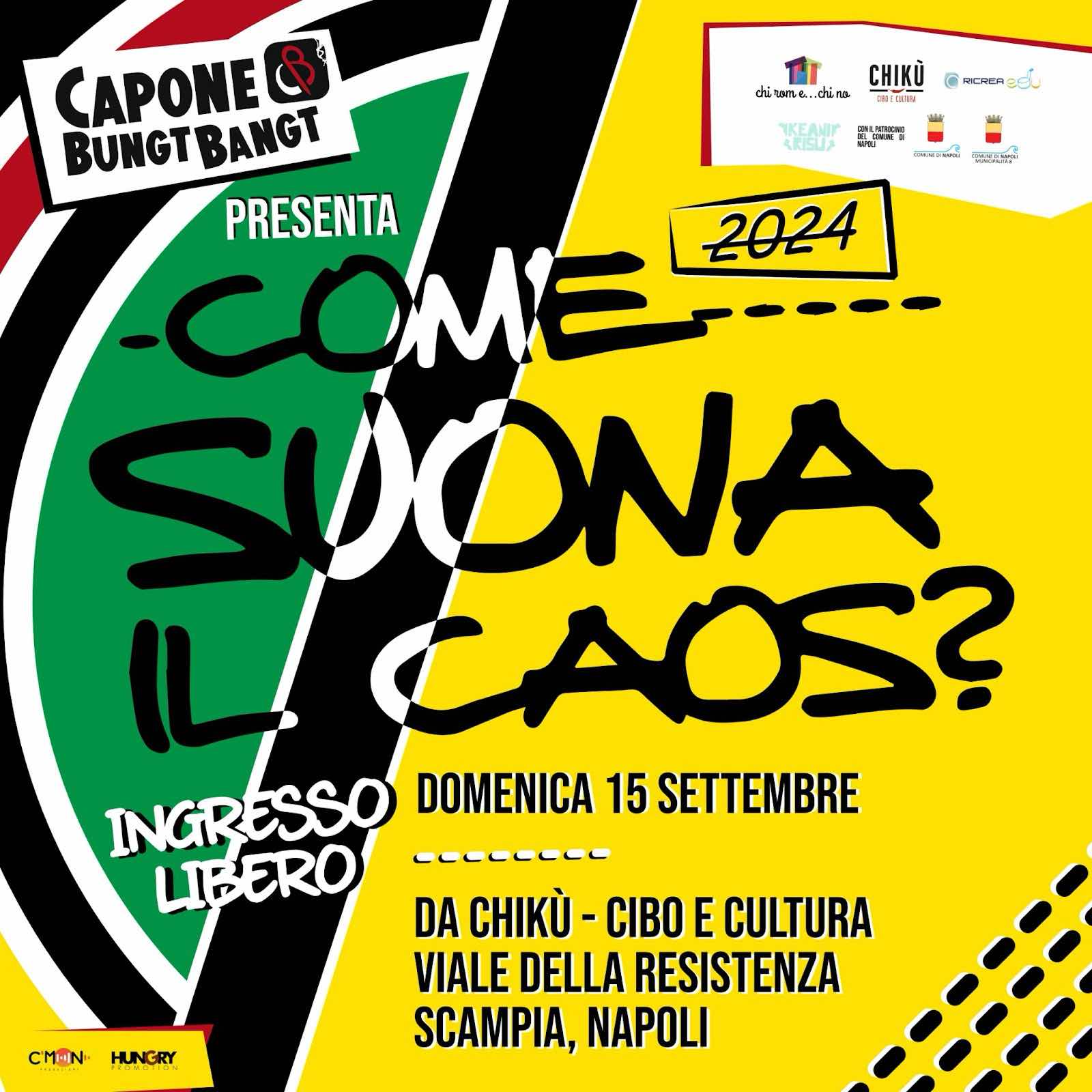 COME SUONA IL CAOS 2024 (Edizione Scampia) ECO SOSTENIBILITÀ, MUSICA, ARTE, DIRITTI CIVILI A SCAMPIA con Capone & BungtBangt e ospiti d’eccezione come Zulù (99 Posse), Franco Ricciardi, Peppe Lanzetta, 'A67, 'O Rom, PeppOh