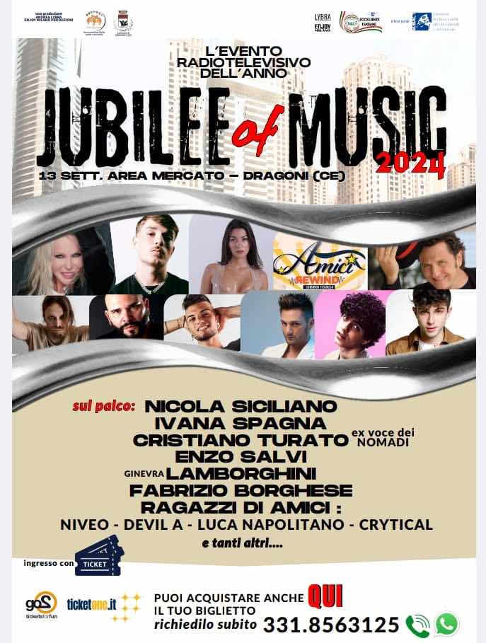 Torna in scena Jubilee of Music edizione 2024 venerdì 13 settembre ore 21.00 a Dragoni provincia di Caserta nell’ Area Mercato dove si esibiranno grandi nomi del panorama musicale italiano nonché esponenti importanti del mondo della cultura e della TV.