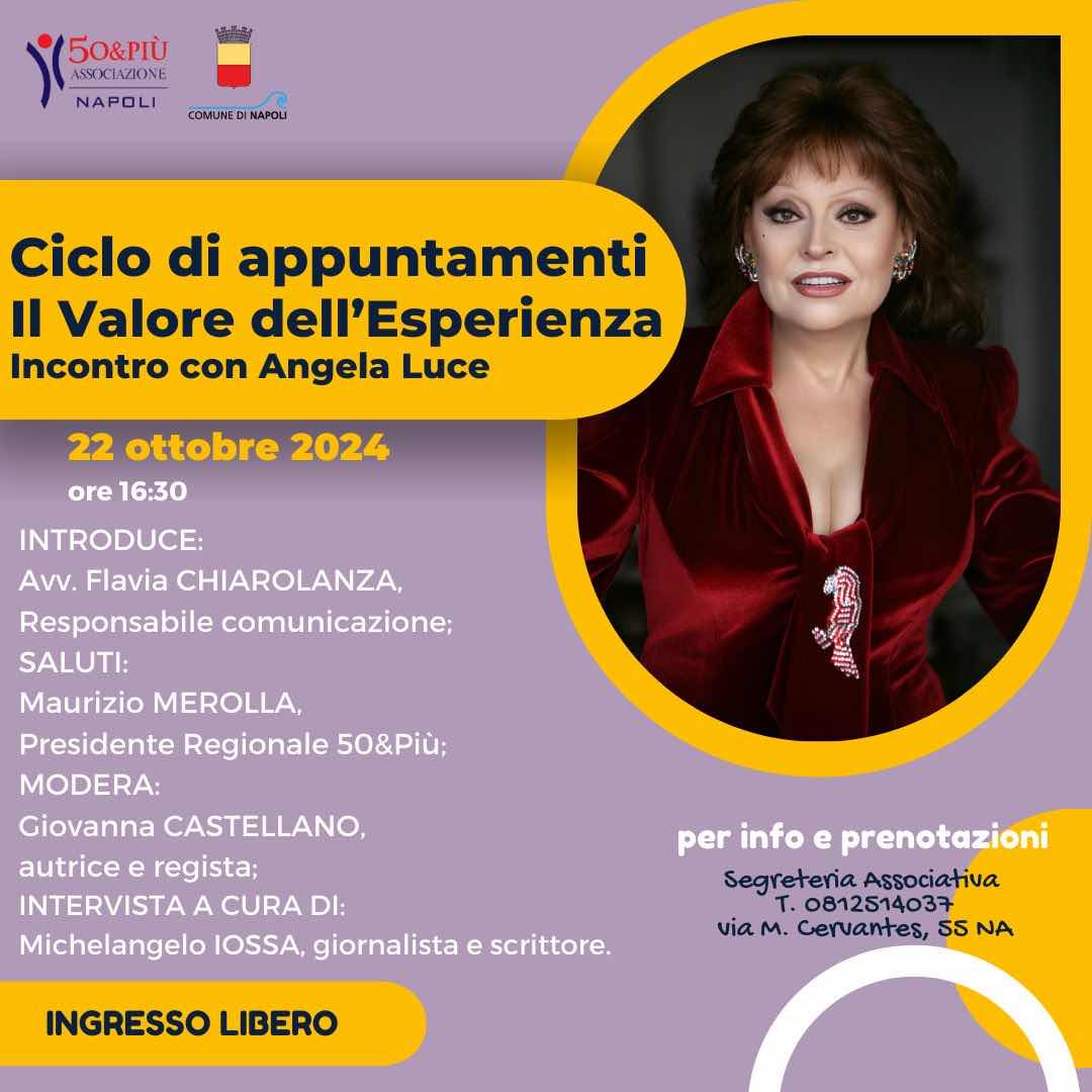 La seconda edizione del ciclo di appuntamenti della rassegna “Il Valore dell’Esperienza” giunge al suo secondo incontro: MARTEDÌ 22 OTTOBRE 2024 alle ore 16.30, gli spazi della Sala Eventi “Vincenzo Cozzolino” della sede partenopea dell’Associazione 50&PIÙ (in Via Cervantes, 55 - Napoli) vedranno protagonista la diva dello spettacolo, del cinema e della musica ANGELA LUCE.