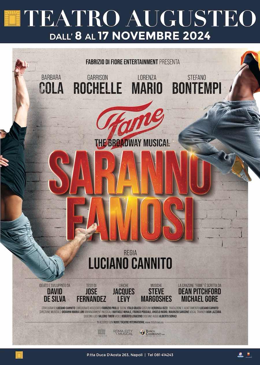 Il teatro Augusteo (Napoli, Piazzetta duca D’Aosta 263) inaugura la nuova stagione teatrale con un musical che ha appassionato intere generazioni: “Saranno famosi. Fame - Il musical”, con la regia di Luciano Cannito, in scena da venerdì 8 a domenica 17 novembre 2024. Sul palco i protagonisti Barbara Cola (Miss. Sherman), Garrison Rochelle (Mr. Myers), Lorenza Mario (Miss Bell), Stefano Bontempi (Mr. Sheinkopf); e con Alice Borghetti (Carmen Diaz), Flavio Gismondi (Nick Piazza), Ginevra Da Soller (Serena Kats), Alfredo Simeone (Joe Vegas), Raymond Ogbogbo (Tyrone Jackson), Alessio Solla (Shlomo), Greta Arditi (Iris Kelly), Arianna Massobrio (Grace), Claudio Carlucci (Goody); e con, direttamente da Amici, Martina Giovannini (Mabel Washington).