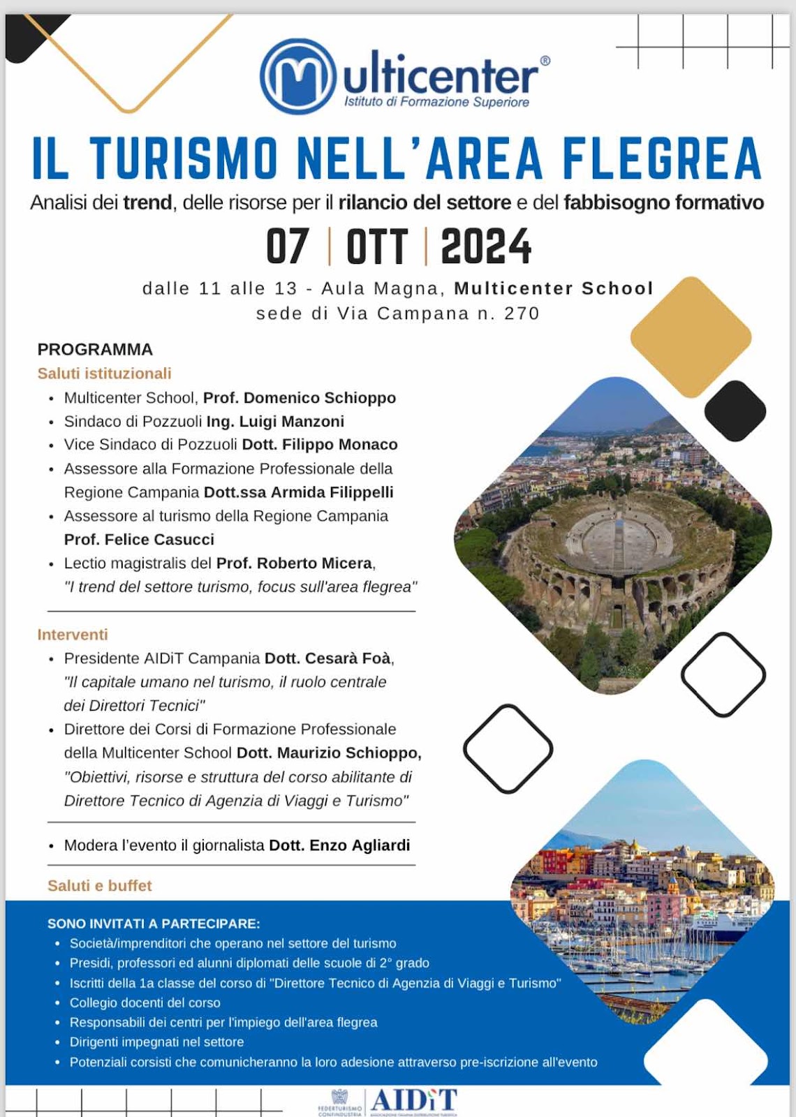 Previsti i saluti istituzionali di Domenico Schioppo(Multicenter school), del Sindaco di Pozzuoli Luigi Manzoni e del vicesindaco Filippo Monaco, dell’assessore alla Formazione Professionale dellaRegione Campania Armida Filippelli e dell’assessore regionale al Turismo Felice Casucci. Prevista poi la Lectio magistralis di Roberto Micera sul tema "I trend del settore turismo, focus sull'area flegrea" e gli interventi del Presidente AIDiT Campania CesareFoà ("Il capitale umano nel turismo, il ruolo centraledei Direttori Tecnici") e del Direttore dei Corsi di Formazione Professionale della Multicenter SchoolMaurizio Schioppo (sul tema "Obiettivi, risorse e struttura del corso abilitante di Direttore Tecnico di Agenzia di Viaggi e Turismo". Modera l’evento il giornalista Enzo Agliardi.