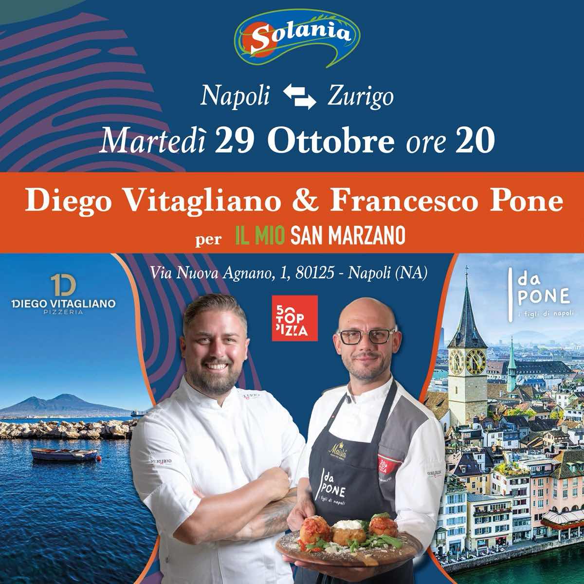 Si annuncia straordinario per tutti gli amanti della pizza l’evento “Napoli - Zurigo: Andata e Ritorno per il Mio San Marzano”, una serata a 4 mani che vedrà protagonisti due maestri pizzaioli, presso la Pizzeria 10 di Via Nuova Agnano, 1 di Diego Vitagliano martedì 29 ottobre alle ore 20.00. Partner dell’evento, Solania srl azienda leader nel settore della raccolta e della trasformazione del pomodoro San Marzano.