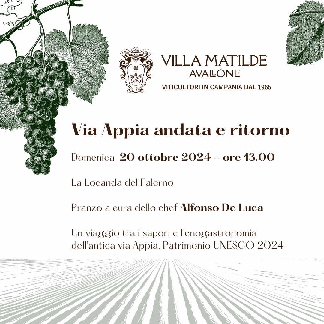 La Locanda del Falerno di Villa Matilde Avallone ospiterà - in un viaggio fatto di gusto e tradizione - un pranzo che prende il nome di “VIA APPIA, ANDATA E RITORNO”, la terza di una serie di degustazioni che celebrano la Campania Felix.