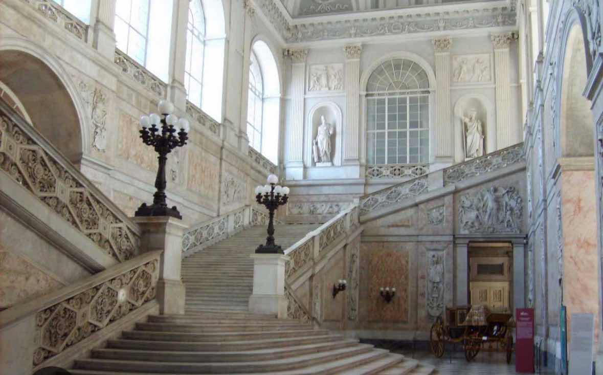 Lo Scalone fu definito nel 1729 da Montesquieu “le plus beau escalier d’Europe”, ma quando il celebre filosofo ebbe modo di ammirarlo l’opera era costruita da Francesco Antonio Picchiatti tra il 1651 e il 1666 in pietra di piperno. In realtà quello che vediamo oggi fu progettato ex novo in marmo da Gaetano Genovese nel restauro generale dell’edificio risalente agli anni Quaranta del XIX secolo e rappresenta il simbolo del Palazzo Reale di Napoli.