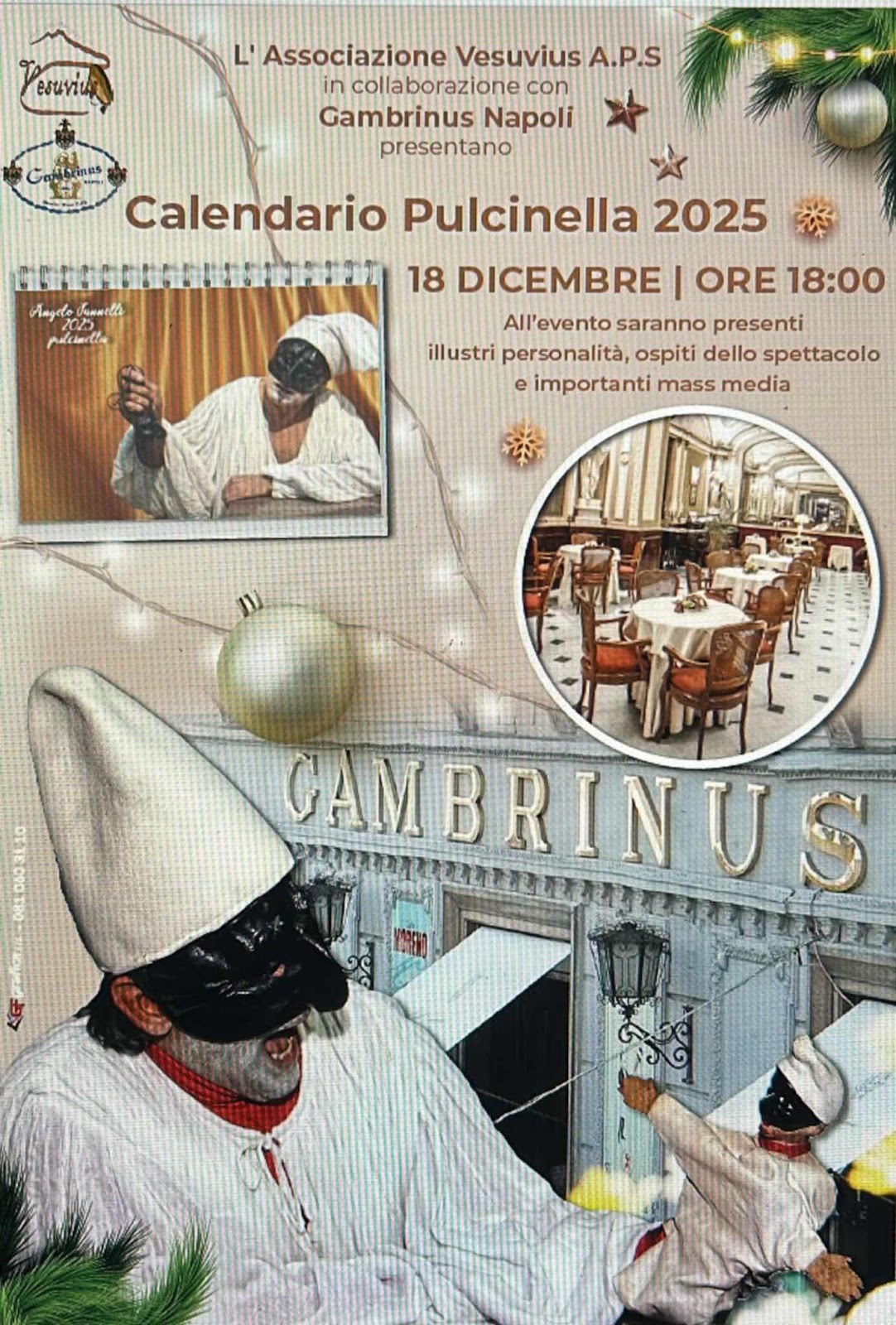 Si svolgerà il 18 dicembre 2024 alle ore 18:00 presso lo storico Bar Gambrinus di Napoli la presentazione ufficiale del Calendario Pulcinella 2025. L’evento è organizzato dall’Associazione Vesuvius A.P.S.in collaborazione con il Caffè Gambrinus, vedrà protagonista Angelo Iannelli, noto artista e interprete del personaggio simbolo della cultura partenopea: Pulcinella. Interverranno : Massimiliano Rosati imprenditore Gran Caffè Gambrinus , Domenico Scafoglio Antropologo studioso della Maschera di Pulcinella , Angelo Iannelli Attore (Pulcinella) ideatore del progetto, Mimmo Falco Vicepresidente Ordine dei Giornalisti della Campania , Mario Maglione Cantante , Nino Daniele Scrittore già assessore cultura e Turismo Comune di Napoli , Cosimo Alberti Attore Rai Fiction Un Posto al Sole, modera Edda Cioffi Conduttrice tv e Psicologa e tanti altri ospiti a sorpresa delle istituzioni dello spettacolo , della cultura e importanti mass media. Un’occasione imperdibile per celebrare l’arte, la tradizione e lo spirito autentico di Napoli, attraverso le immagini che comporranno il calendario 2025 dedicato a Pulcinella. Conosciuto come “l’Ambasciatore del Sorriso”, Angelo Iannelli porta avanti con dedizione la cultura napoletana e il personaggio di Pulcinella in tutto il mondo dandogli un volto sociale, sempre in difesa dei più deboli e dei meno fortunati. Questo calendario rappresenta un omaggio alla città, alla sua storia e ai suoi valori e vuole avvicinare la maschera più importante al mondo alla nomina di Patrimonio Unesco come bene immateriale, occasione anche per augurarsi il Buon Natale.