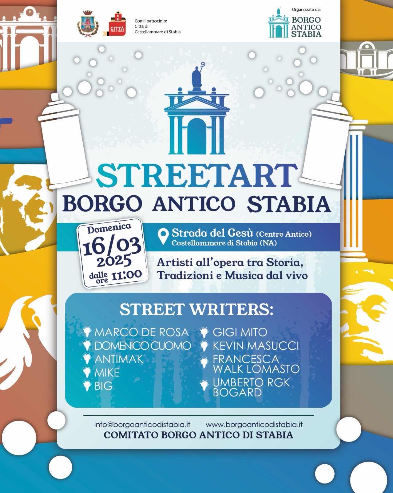 “Sara’ una festa domenicale da condividere con l’intera comunità - illustra Francesco Napolitano, Presidente del Comitato Borgo Antico di Stabia - Ringrazio i delegati del nostro direttivo Emilio Maggio e Luisa Del Sorbo, il writers Marco De Rosa che ha coordinato gli artisti, Iolanda Salvato da sempre impegnata nel mondo del cinema e del teatro. Un gruppo affiatato che sta operando in prima linea per la promuovere il centro storico stabiese e creare continue sinergie anche con altre associazioni, tipo Rotaract e Stabia Post Fata Resurgo, per riaccendere i riflettori sul Borgo Antico di Stabia. Ma ringrazio soprattutto i residenti del centro storico, i commercianti, il Sindaco Luigi Vicinanza e l’intera macchina comunale, che ci supportano ad ogni passo, Polizia Municipale e Polizia di Stato e il team della SIAE, che ci stanno indirizzando anche dal punto di vista burocratico”.