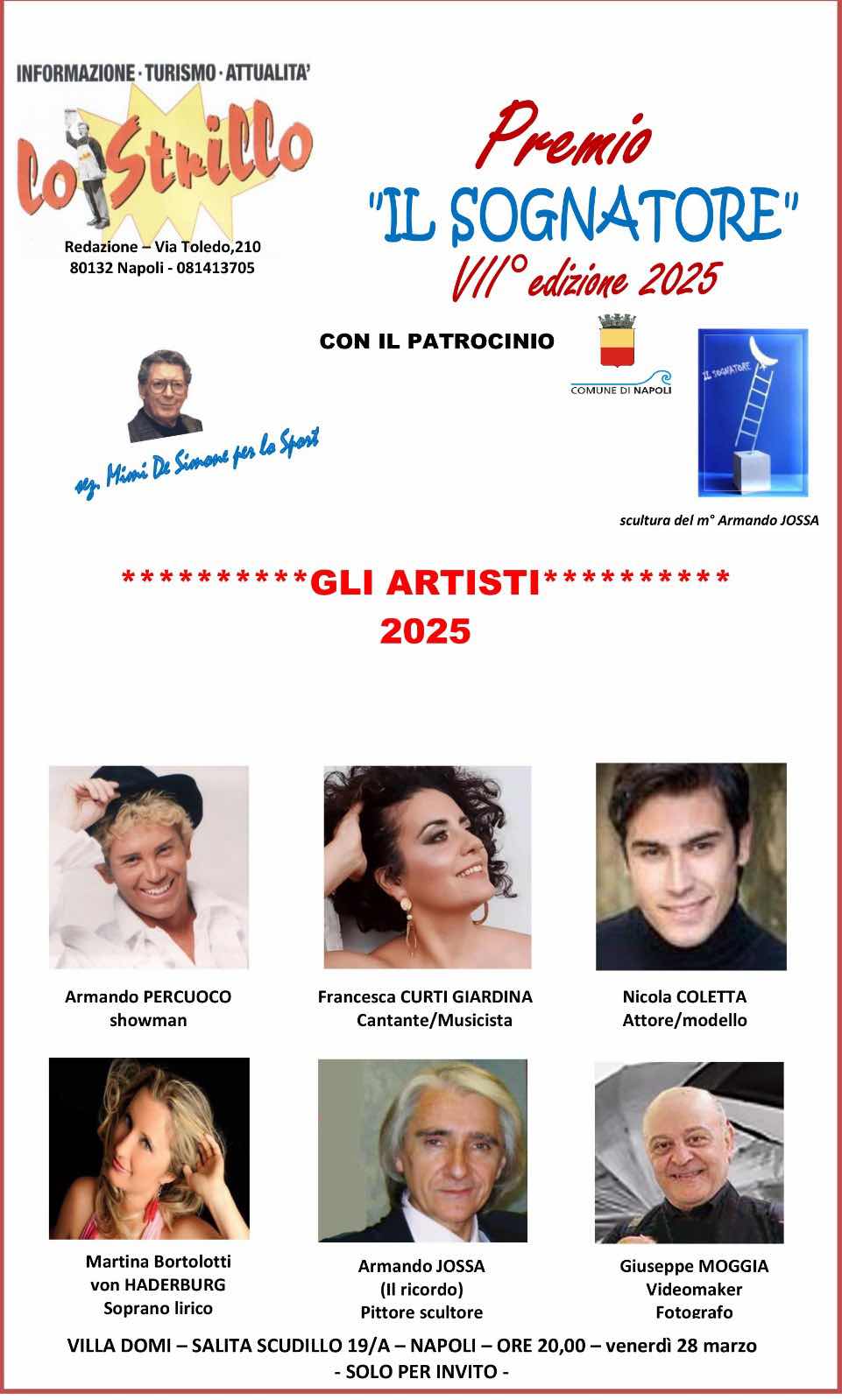 Si terrà il prossimo 28 marzo, alle ore 20,00, presso Villa Domi – Sala Bianca (via Salita Scudillo, 19/A, Napoli), in una serata-evento (ad inviti), la VII° edizione del premio "IL SOGNATORE", istituito dal giornale Lo Strillo, che gode del patrocinio morale del Comune di Napoli e che verrà consegnato a 6 personalità che, secondo il parere insindacabile dell’organizzazione, sono dei sognatori, o per il loro percorso di vita, o perché hanno fatto sognare gli altri, o perché hanno realizzato i loro sogni. Il premio consiste in un’originale e caratteristica scultura, ideata dal compianto m° Armando Jossa, scomparso di recente, al quale verrà tributato un giusto ricordo dalnostro Giuseppe Moggia. I premiati di questa nuova edizione sono: l’avvocato Gerry Danesi, delegato rettorale per il Terzo Settore e la Cooperazione Internazionale presso l’Università Popolare Cattolica “Montemurro-D’Ippolito”, Console Onorario della Repubblica del Nicaragua - Giurisdizione Regione Campania e Isole minori, Responsabile Nazionale Settore Giustizia della FE.N.CO. (Federazione Nazionale dei Diplomatici e Consoli Esteri in Italia), Presidente Comm. Giustizia e Affari Legali del Corpo Diplomatico Consolare Napoli-Campania, giornalista pubblicista, autore del libro pluripremiato “Filo Spinato”, da oltre 20 anni si occupa di devianza minorile e sostegno alle donne maltrattate, contro le differenze di genere e lo stigma, curando progetti di legalità e sostegno per le categorie maggiormente esposte e fragili, che cura con l’Alma Mundi onlus odv, associazione di cui è presidente; il Tenente Colonnello Gianfranco Paglia, Medaglia D’Oro Al Valor Militare, che nel 1993 ha perso l’uso delle gambe a Mogadiscio, durante l’operazione “Checkpoint Pasta”, la cui storia ha ispirato la fiction “Le ali”, trasmessa su Rai 1 il 9 novembre 2008, capitano delGruppo Sportivo Paralimpico della Difesa, si occupa delle iniziative sportive per il personale militare con disabilità, attualmente è consigliere del ministro della difesa Guido Crosetto, a lui andrà il Premio Il Sognatore - Mimì De Simone, dedicato alla memoria del direttore e fondatore de Lo Strillo; Jessica Aiello, danzatrice, coreografa e attrice palermitana, presente in numerose fiction e nei principali musical italiani (”Manon Lescaut”,“Romeo et Juliette”, “La Piccola Bottega degli Orrori”, “Aladin il musical geniale”, “Elvis the Musical”, “L’amore vincerà, “C’era una volta le Favole…”), protagonista nel docureality “Compagni di ballo” su Mtv, del docufilm “Gioventù sballata”, insegnante diHip Hop, Videodance, danza Classica, Modernjazz e Pilates Matwork; Stefano Buttafuoco, giornalista professionista, inviato di programmi di punta, conduttore Rai, dal 2022 ideatore e conduttore de “Il Cacciatore di Sogni”, il format dell’inclusione in onda su Rai Tre giunto alla sua quinta stagione, autore del libro “Il Bambino 23. La storia e i sogni di Brando”, ideatore dell’associazione “Unici”, dedicata alle malattie rare che da 2 anni finanzia un progetto di ricerca - portato avanti dall’Ospedale pediatrico Bambin Gesù - sulla mutazione genetica Camk2; Antonello Perillo, vicedirettore nazionale della Tgr Rai, giornalista professionista, per nove anni Caporedattore Responsabile della Tgr Campania, ha lanciato su RaiTre “Mezzogiorno Italia”, ha supervisionato la trasmissione “Cammini di Speranza” per il Giubileo, è stato il primo conduttore televisivo italiano a trasmettere in diretta nazionale da uno "studio virtuale", quello del Tg3 Neapolis, autore di alcuni libri, tra i quali “Capri l’Isola che c’è”, “Cuore Azzurro” e “Il Vangelo secondo Diego”; Simone Testa, chef di "Punto Nave", un luogo di ritrovo per i pescatori locali e per i commensali amanti dei sapori veraci e unici di Pozzuoli, attraverso i suoi piatti, riesce a raccontare storie di luoghi lontani, trasportando il suo pubblico in un viaggio sensoriale unico. La Menzione speciale alla memoria sarà assegnata a Pietrangelo Gregorio, l’ingegnere che ha dedicato la sua vita alla TV, il fondatore della TV Libera a Napoli, il creatore di Canale 21. Nel corso della serata, condotta dal direttore responsabile Anna Maria Ghedina e dal vicedirettore Antonio D’Addio, coadiuvati dal bravo top model e talentuoso attore Nicola Coletta, ci saranno vari momenti di spettacolo affidati al soprano lirico di fama internazionale Martina Bortolotti von Haderburg, allo showman Armando Percuoco e alla nota interprete della canzone napoletana classica e moderna Francesca Curti Giardina. Un ringraziamento va a chi ha consentito la serata ovvero Villa Domi con il suo patron Domenico Kontessa, la boutique Keave, la cooperativa del Golfo e Mercato dei fiori di Ercolano, Glemart Grafica e Stampa, l’Asd Social Event e Promotion di Luana R. Cavazzuti, Armando De Nigris Editori, l’Ente Sportivo Sociale Europeo, la residenza storica “Carafa di Maddaloni”, Le Shopper di Sabry Abbrunzo. Fotografo e videomaker ufficiale: Giuseppe Moggia. Prevista la partecipazione di personalità del mondo dello spettacolo, della cultura, del giornalismo, dell’arte e dell’imprenditoria, che hanno già confermato la loro presenza, ma che manteniamo top secret per non rovinare le sorprese. Al termine un ricco buffet offerto da Villa Domi.