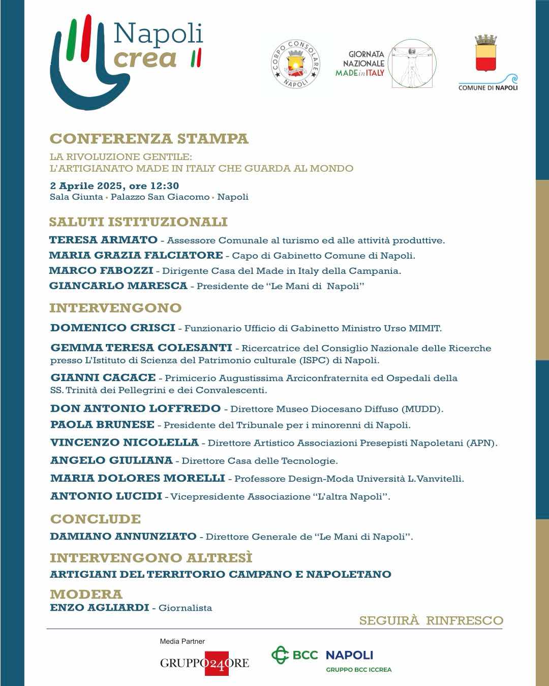 Partendo dal tema di fondo proposto dal MIMIT per la II°Giornata Nazionale del made in Italy, ovvero “il Made in Italy tratradizione e innovazione”, “Le Mani di Napoli” ripropongono il format di “Napoli Crea” con una parte convegnistica dedicata a confronti sui modi in cui l'artigianato creativo, e in particolare quello a matrice tradizionale locale, può incrementare la propriaefficienza in favore dell'immagine del nostro Paese, oltre che del suo prodotto interno, e il peso che può avere per l'identità e l'indipendenza dei giovani e anche degli anziani, atteso che comporta abilità spendibili a qualsiasi età.