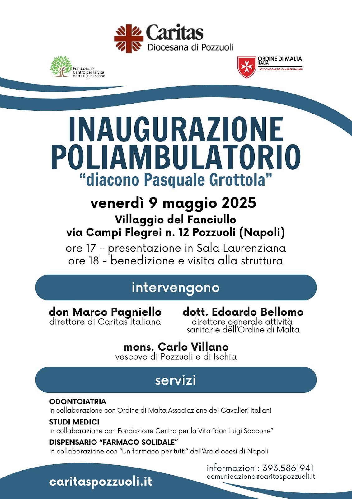 Seguirà benedizione e inaugurazione della struttura. Il Poliambulatorio è dedicato a Pasquale Grottola - che fu diacono e operatore sanitario al servizio della Caritas Diocesana di Pozzuoli - e offrirà alla popolazione indigente i seguenti servizi: studi medici (in collaborazione con la Fondazione “Centro per la Vita - don Luigi Saccone”), studi odontoiatrici (in collaborazione con l’Ordine di Malta - Associazione dei Cavalieri Italiani) e il Dispensario “Farmaco Solidale” (in collaborazione con il progetto “Un farmaco per tutti” dell’Arcidiocesi di Napoli).
