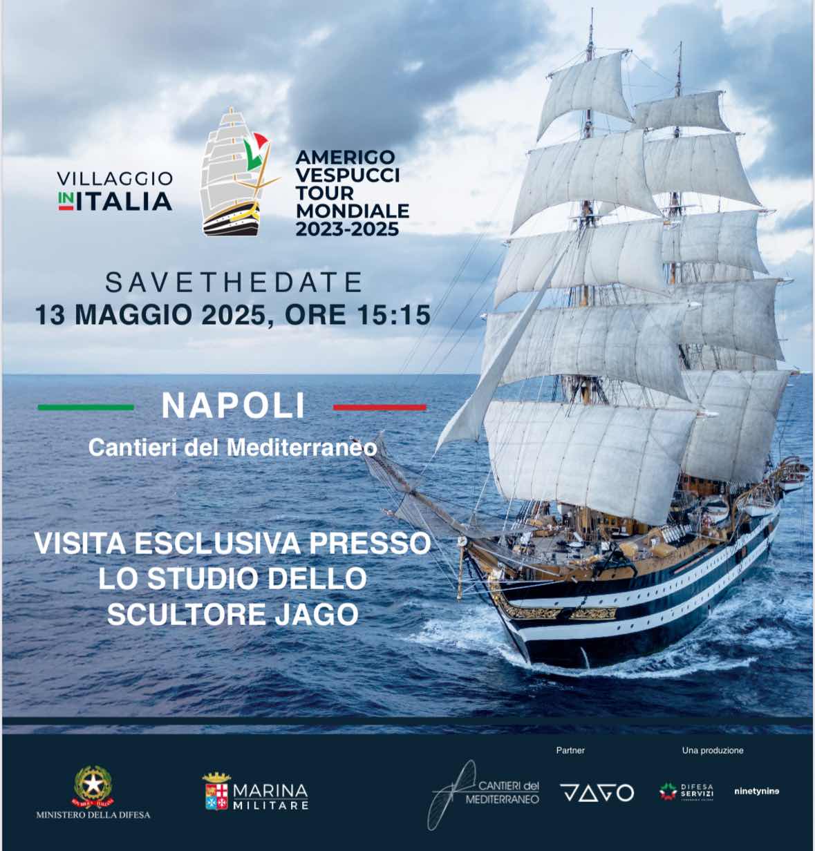 12 maggio 2025 - In occasione della tappa napoletana del Tour Mediterraneo Vespucci, in programma dal 13 al 16 maggio, l’artista scultore italiano contemporaneo Jago si racconterà al pubblico di Napoli, città che ha scelto per il suo studio-museo, aprirà alla stampa le porte del suo laboratorio nei Cantieri del Mediterraneo e esporrà “La David”, modello in bronzo dell’opera scultorea che ha accompagnato Nave Amerigo Vespucci nelle principali tappe del Tour Mondiale, in prossimità del veliero.
