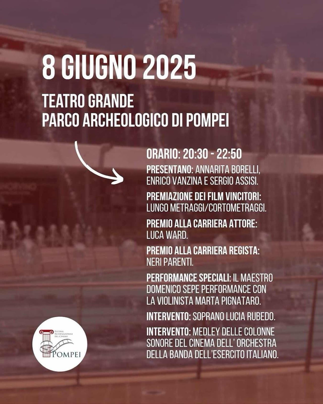 Giornata conclusiva per il Festival Internazionale del Cinema di Pompei, presieduto da Annarita Borelli e con la direzione artistica di Enrico Vanzina, che ha saputo intrecciare cinema, arte e cultura con una partec°8 ipazione calorosa di pubblico e addetti ai lavori. Oggi, domenica 8 giugno, il Teatro Grande del Parco Archeologico ospita la serata di chiusura e premiazione, condotta da Sergio Assisi, con l'assegnazione dei riconoscimenti ai migliori lungometraggi e cortometraggi presentati in concorso.