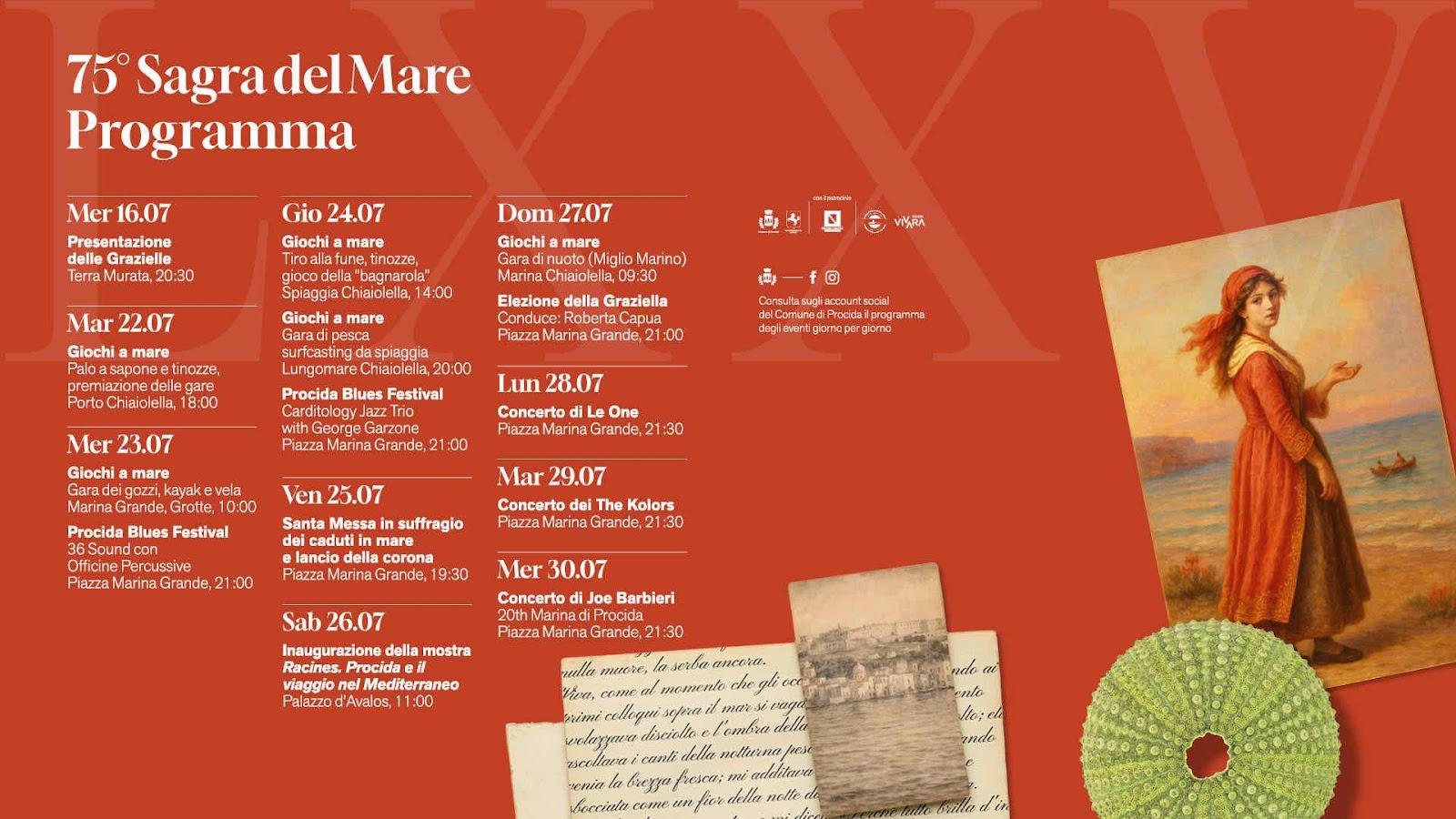 Sarà, dunque, una vera e propria Festa del mare, che abbraccia più momenti: la Santa Messa in memoria dei caduti, con il rito del lancio in mare della corona floreale (25 luglio), la presentazione all’isola delle candidate a Graziella, il Procida Blues Festival, i live a Marina Grande di Le One (28 luglio), The Kolors (29 luglio) e Joe Barbieri (30 luglio), i “Giochi a mare” (la gara in kayak, la corsa delle tinozze, il tiro alla fune) attraverso cui le forme ludiche antiche rivivono tra i procidani.